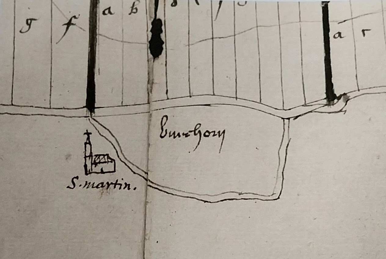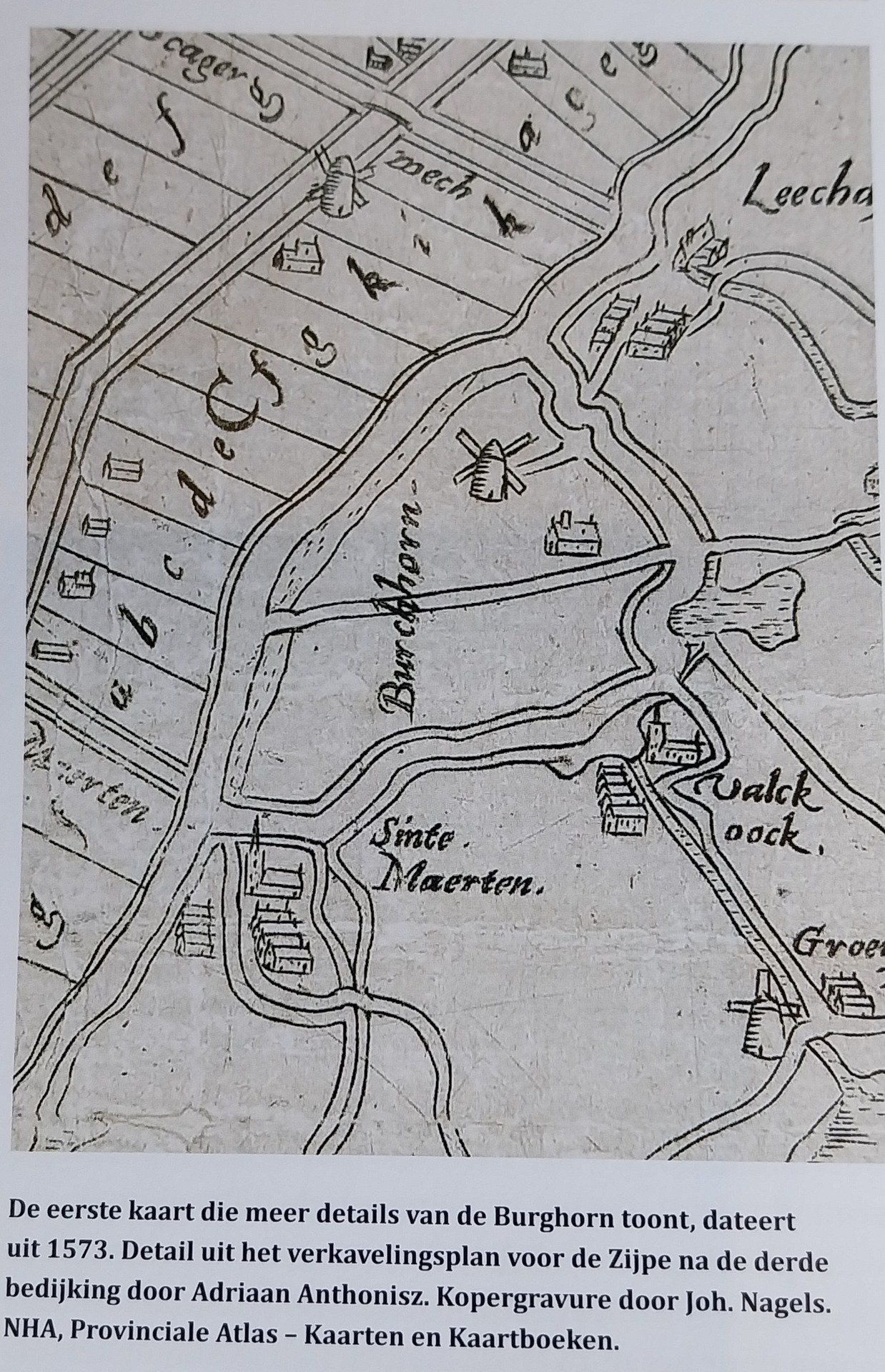 Detail met de Burghorn uit het verkavelingsplan voor de Zijpe na de eerste bedijking van 1553 door Simon Meeuws. Het gaat hier om de vroegst bekende kaart waarop de Burghorn is ingetekend.