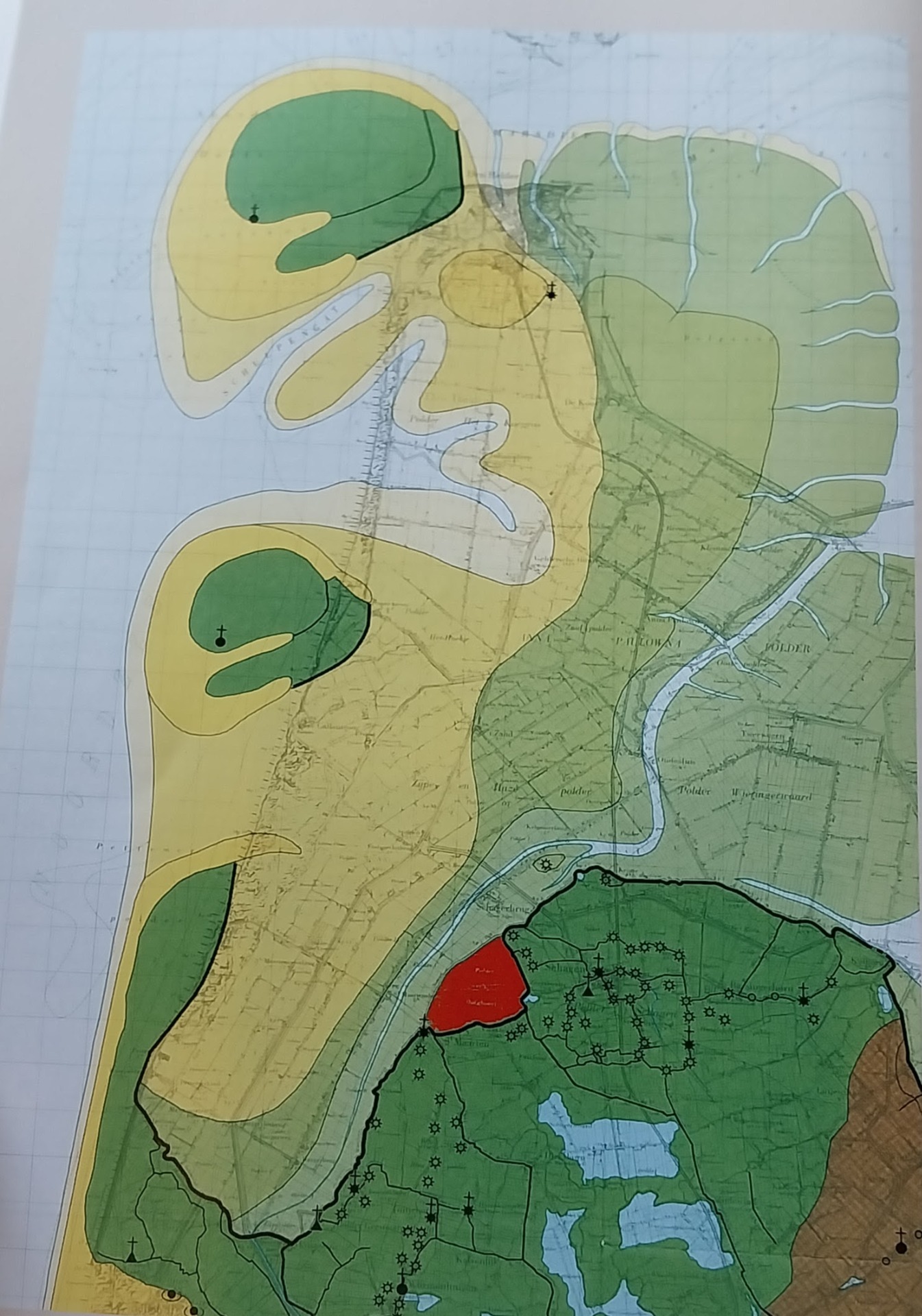 Nu is hier sprake van een karakteristiek stuk land – een landdeken genoemd door Philips de Goede- tussen dijken die hun functie hebben verloren, behalve die ene. Namelijk die van;